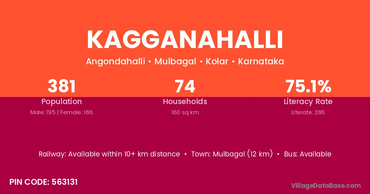 Kagganahalli village has a total population of 381 people, of which 195 are males and 186 are females.