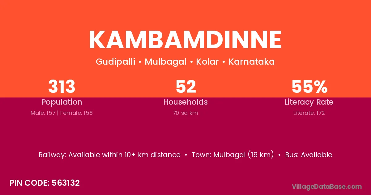 Mulbagal (19 km) is the nearest town to Kambamdinne village for major economic activities and is located approximately 19 km away.