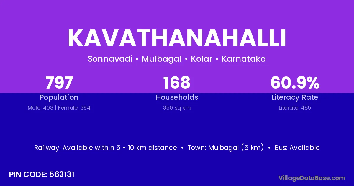 Mulbagal (5 km) is the nearest town to Kavathanahalli village for major economic activities and is located approximately 5 km away.