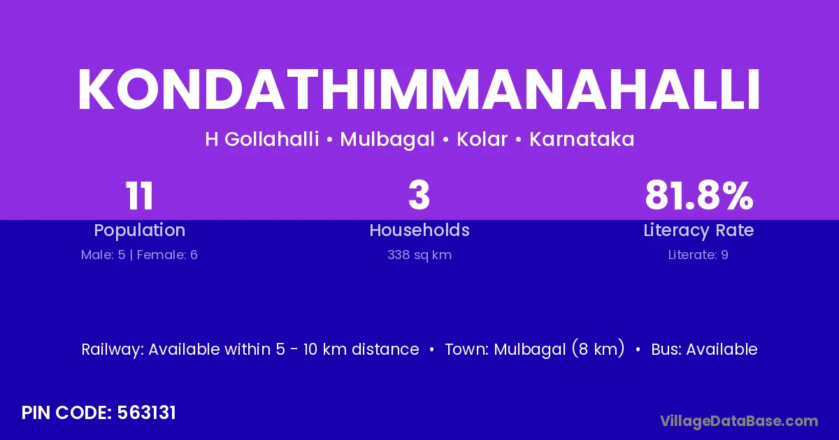 Mulbagal (8 km) is the nearest town to Kondathimmanahalli village for major economic activities and is located approximately 8 km away.