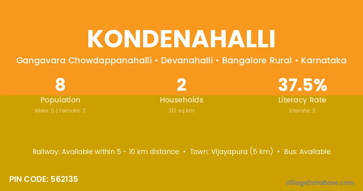 Mulbagal (14 km) is the nearest town to Kondenahalli village for major economic activities and is located approximately 14 km away.