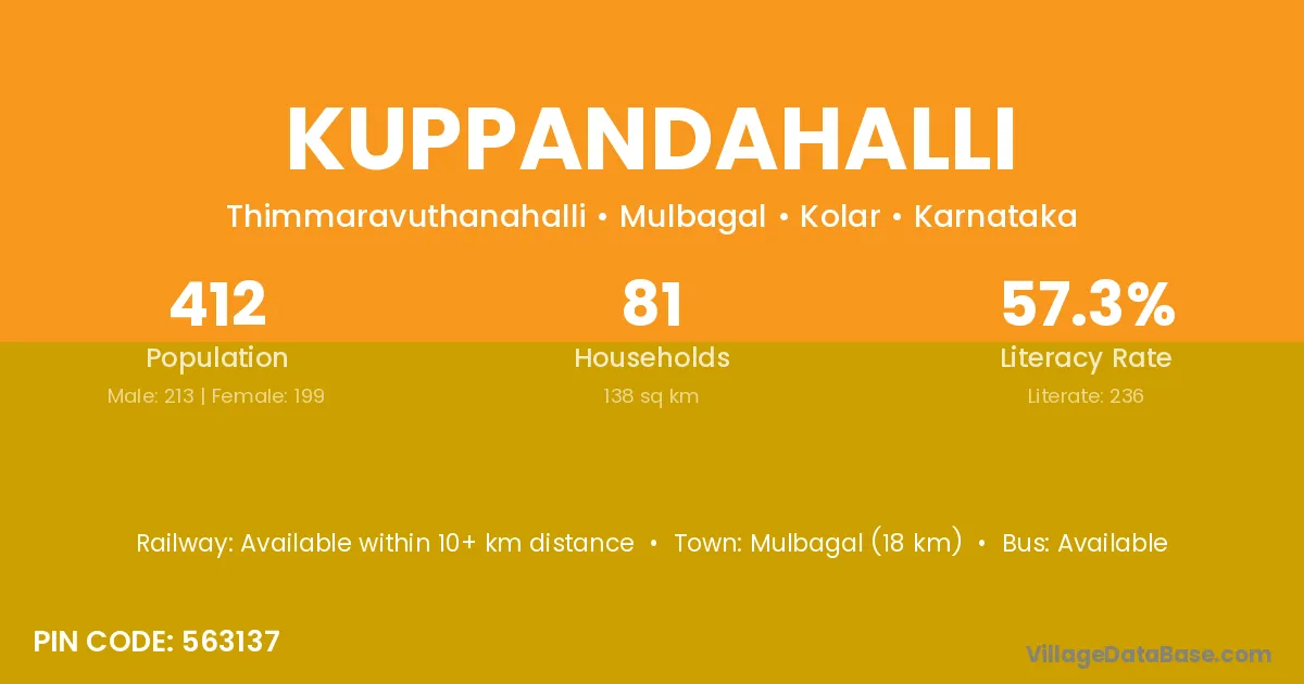 Mulbagal (18 km) is the nearest town to Kuppandahalli village for major economic activities and is located approximately 18 km away.