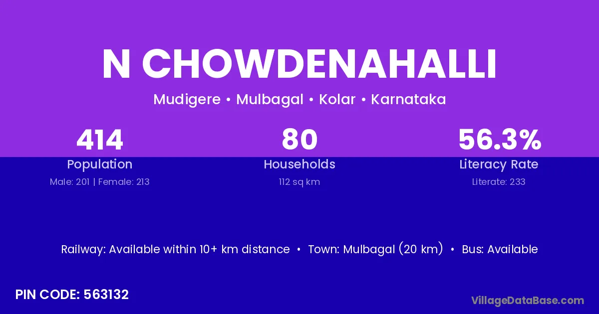 Mulbagal (20 km) is the nearest town to N Chowdenahalli village for major economic activities and is located approximately 20 km away.
