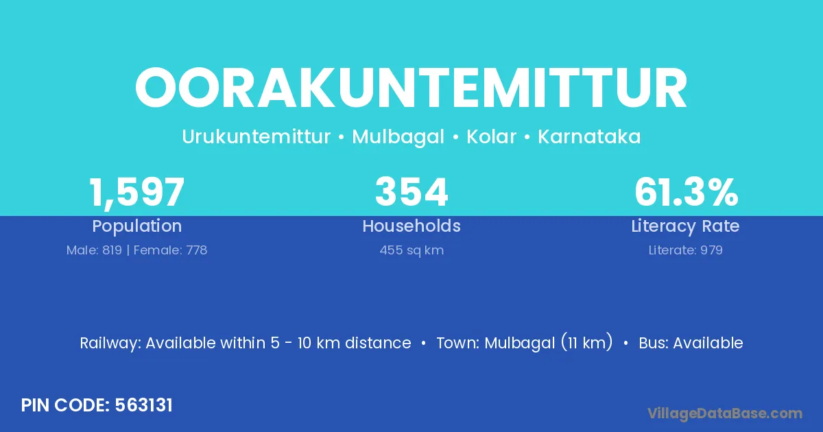 Mulbagal (11 km) is the nearest town to Oorakuntemittur village for major economic activities and is located approximately 11 km away.