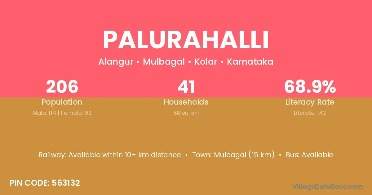 Mulbagal (15 km) is the nearest town to Palurahalli village for major economic activities and is located approximately 15 km away.