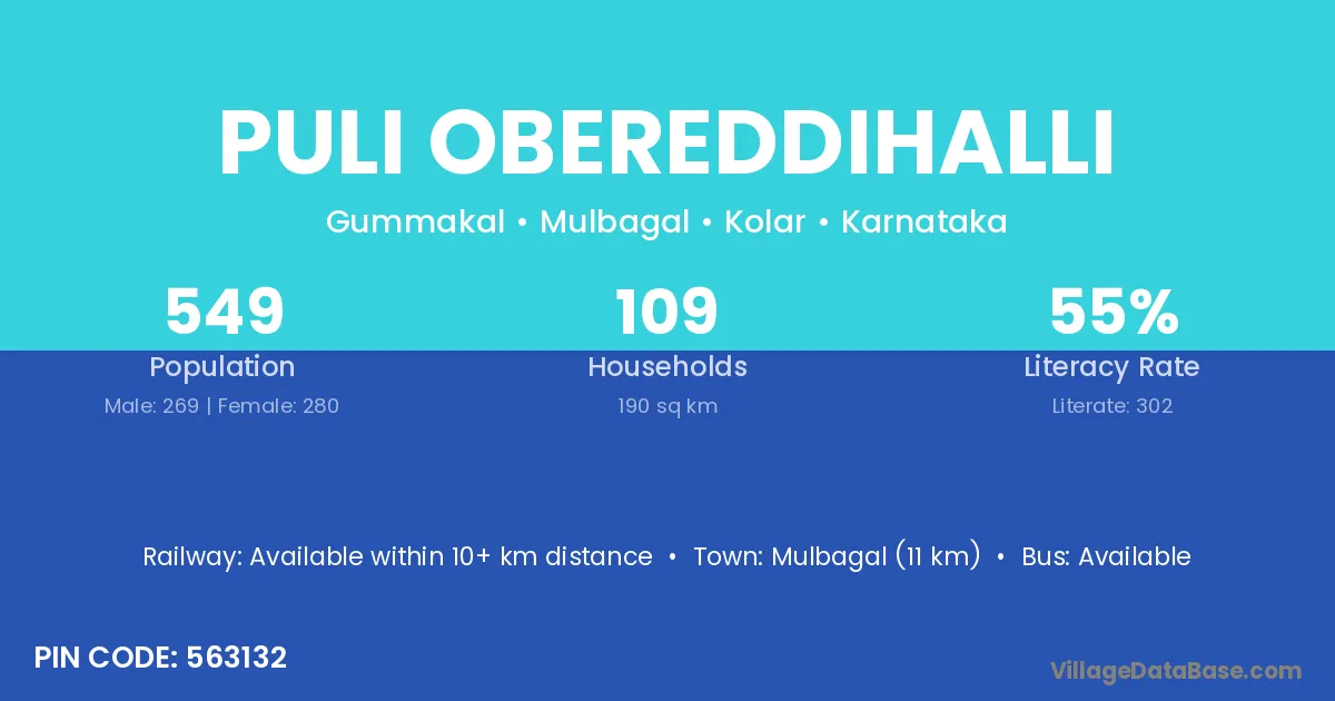 Mulbagal (11 km) is the nearest town to Puli Obereddihalli village for major economic activities and is located approximately 11 km away.