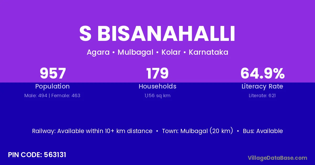 Mulbagal (20 km) is the nearest town to S Bisanahalli village for major economic activities and is located approximately 20 km away.
