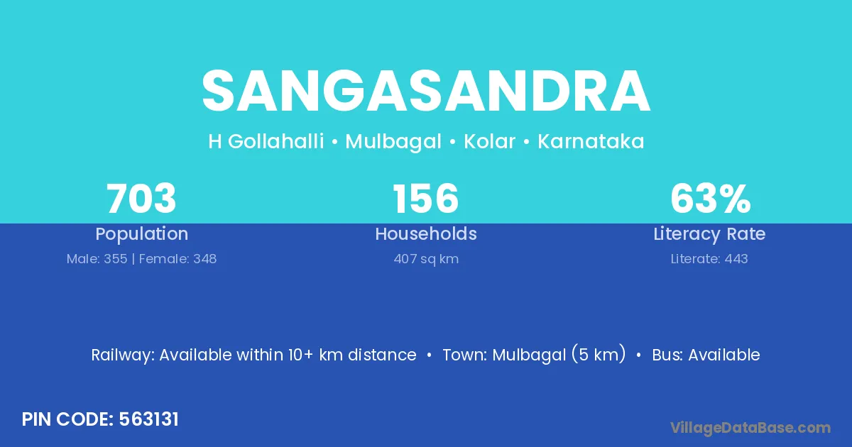 Mulbagal (5 km) is the nearest town to Sangasandra village for major economic activities and is located approximately 5 km away.