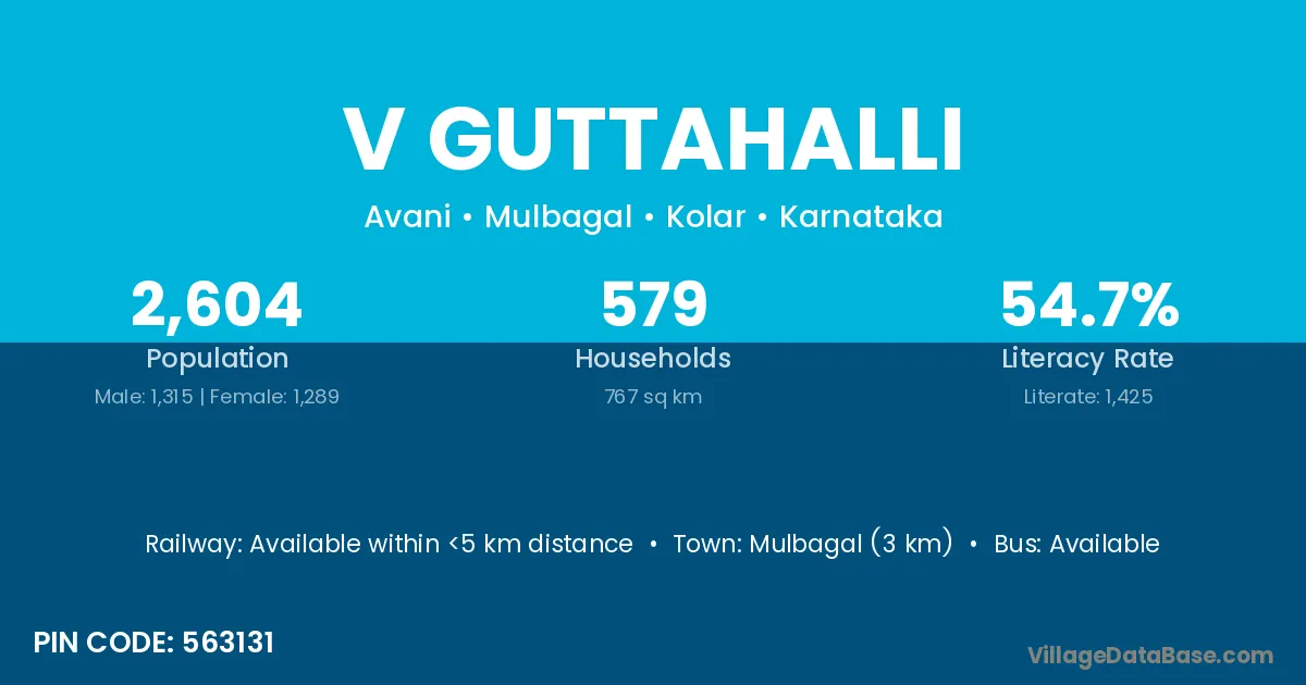 Mulbagal (3 km) is the nearest town to V Guttahalli village for major economic activities and is located approximately 3 km away.