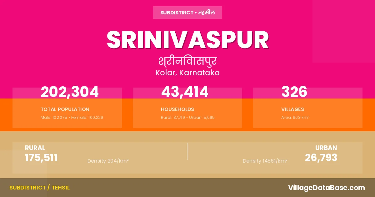 According to the 2011 census The total area of Srinivaspur Taluka is 863 km², with a population of 202304 people. The population density is 234 inhabitants per square kilometre, and there are approximately 43414 houses in the sub district.