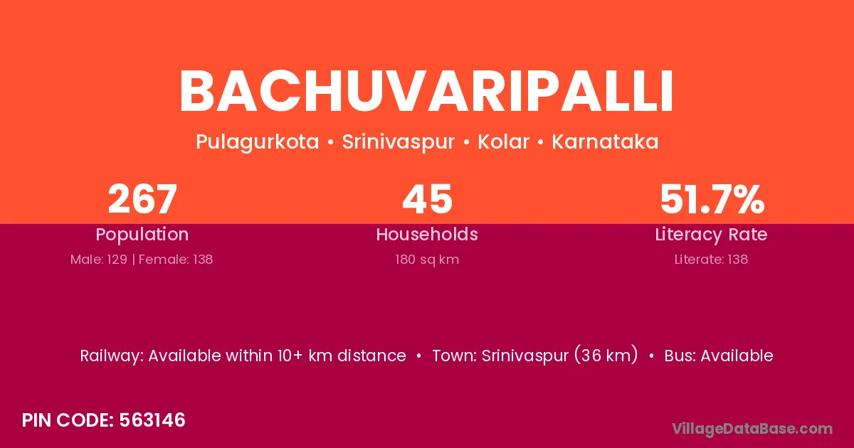 Srinivaspur (36 km) is the nearest town to Bachuvaripalli village for major economic activities and is located approximately 36 km away.