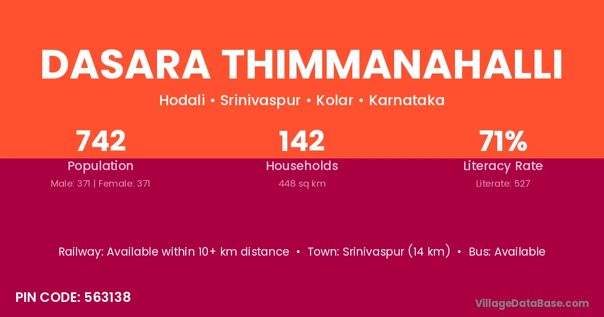 Srinivaspur (14 km) is the nearest town to Dasara Thimmanahalli village for major economic activities and is located approximately 14 km away.