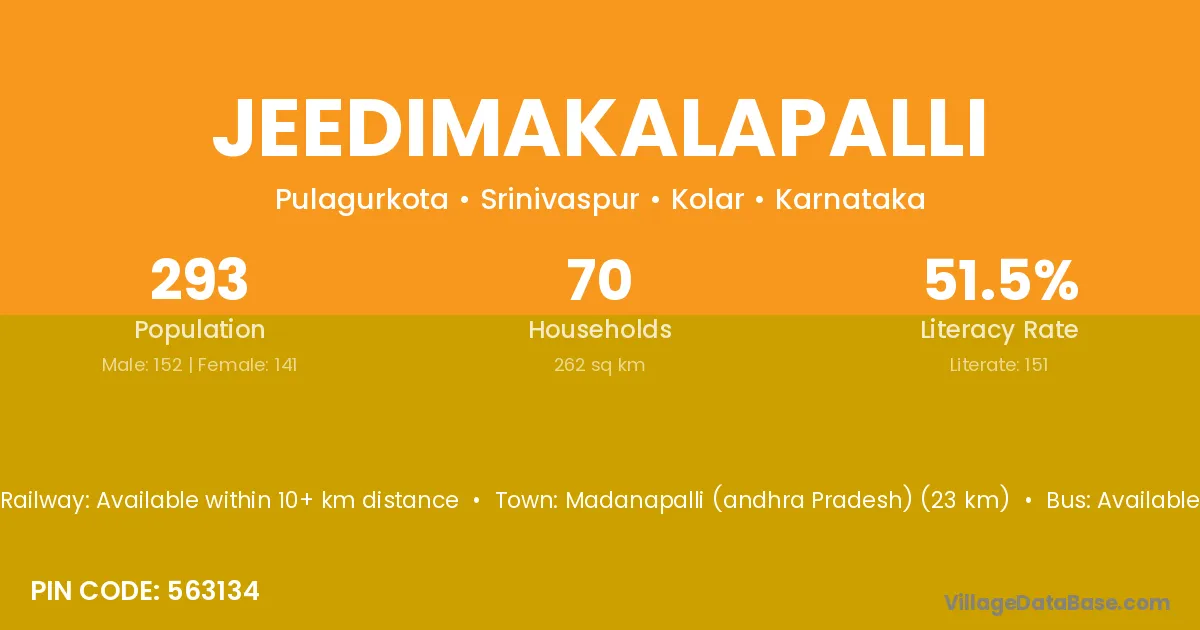 Madanapalli (andhra Pradesh) (23 km) is the nearest town to Jeedimakalapalli village for major economic activities and is located approximately 23 km away.