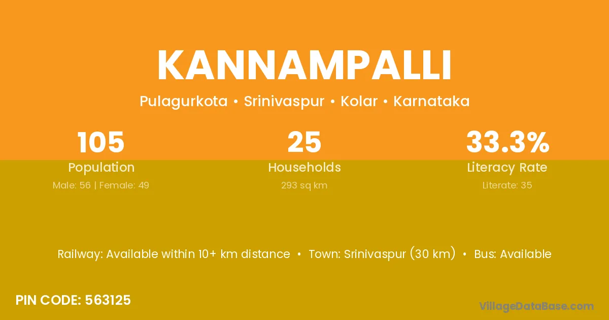 Srinivaspur (30 km) is the nearest town to Kannampalli village for major economic activities and is located approximately 30 km away.