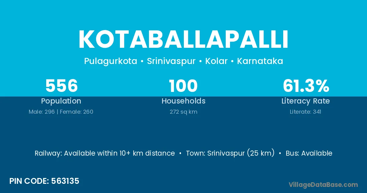 Srinivaspur (25 km) is the nearest town to Kotaballapalli village for major economic activities and is located approximately 25 km away.