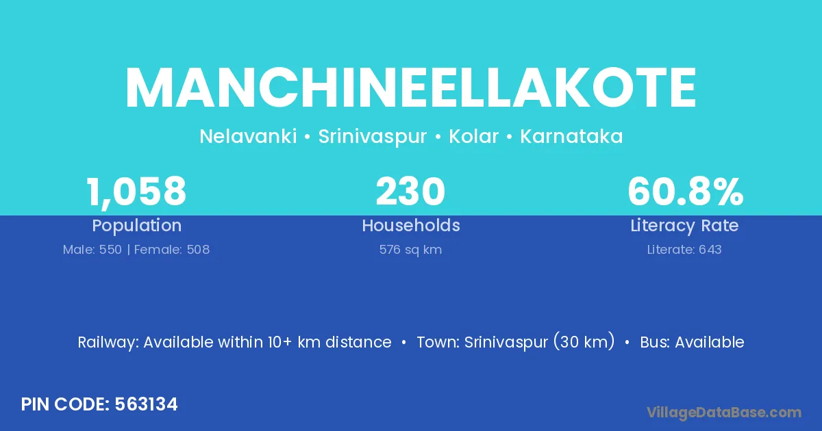 Srinivaspur (30 km) is the nearest town to Manchineellakote village for major economic activities and is located approximately 30 km away.