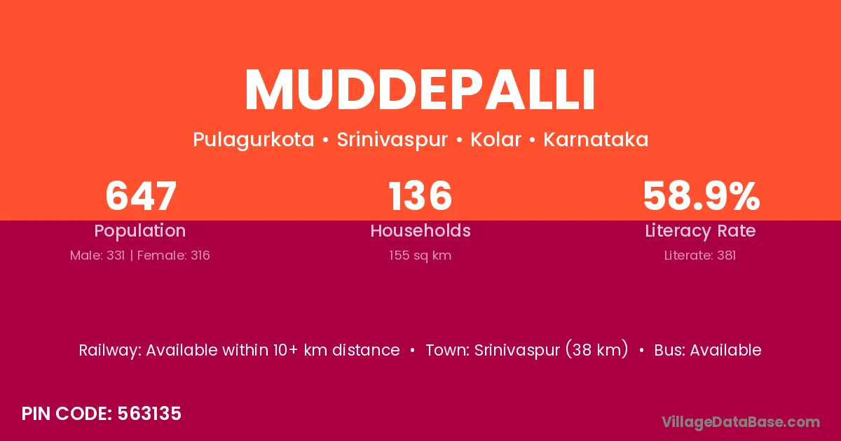 Srinivaspur (38 km) is the nearest town to Muddepalli village for major economic activities and is located approximately 38 km away.