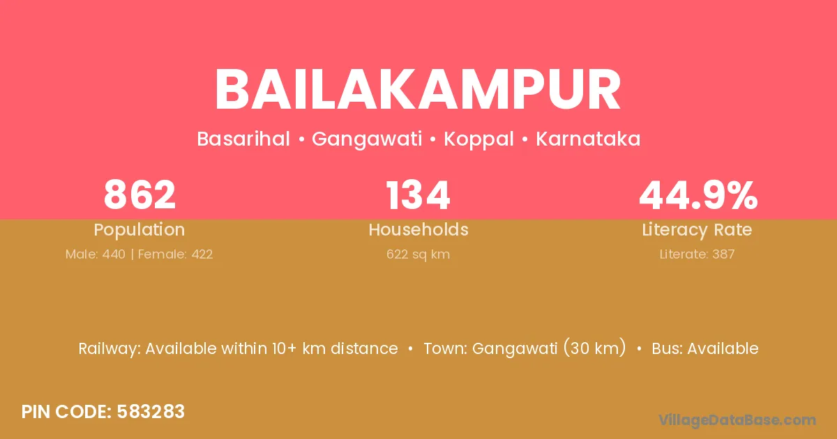 Gangawati (30 km) is the nearest town to Bailakampur village for major economic activities and is located approximately 30 km away.