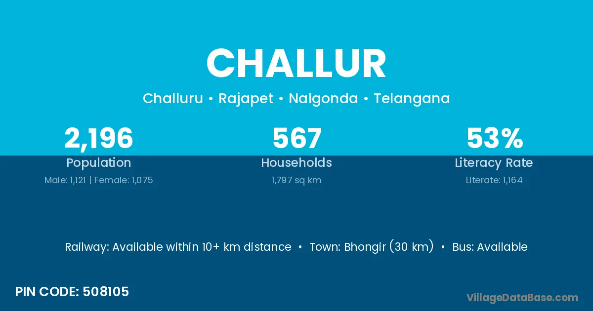 The literacy rate of Challur village is 53.16%. Male literacy stands at 60.59% and female literacy at 45.83%.