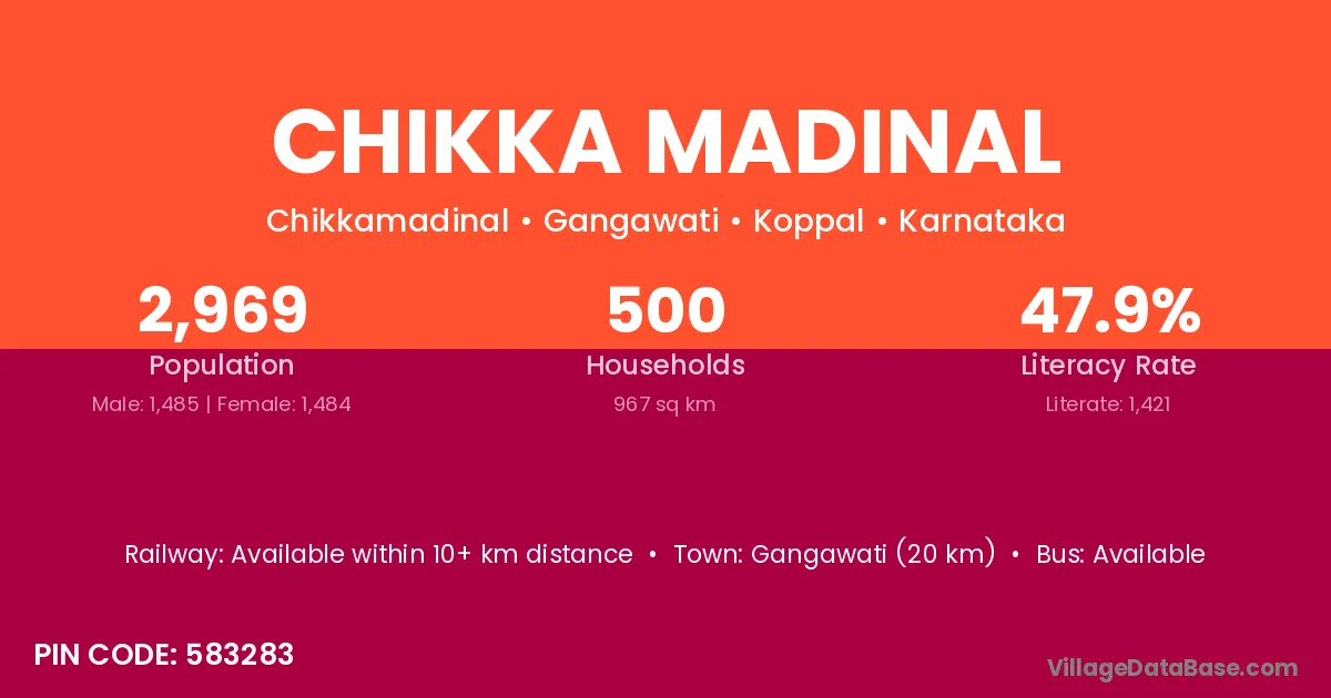 Chikka Madinal village has a total population of 2,969 people, of which 1,485 are males and 1,484 are females.
