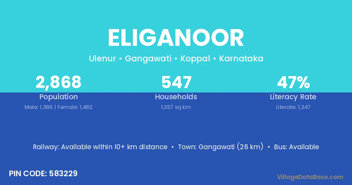 Gangawati (26 km) is the nearest town to Eliganoor village for major economic activities and is located approximately 26 km away.