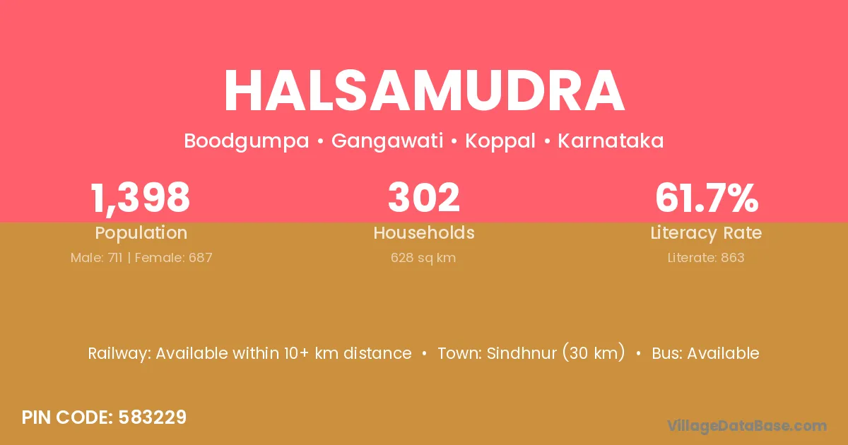 Sindhnur (30 km) is the nearest town to Halsamudra village for major economic activities and is located approximately 30 km away.
