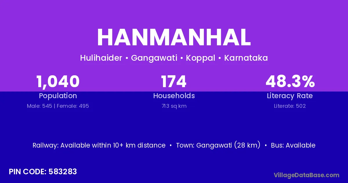 Gangawati (28 km) is the nearest town to Hanmanhal village for major economic activities and is located approximately 28 km away.