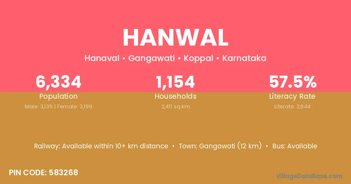 Gangawati (12 km) is the nearest town to Hanwal village for major economic activities and is located approximately 12 km away.