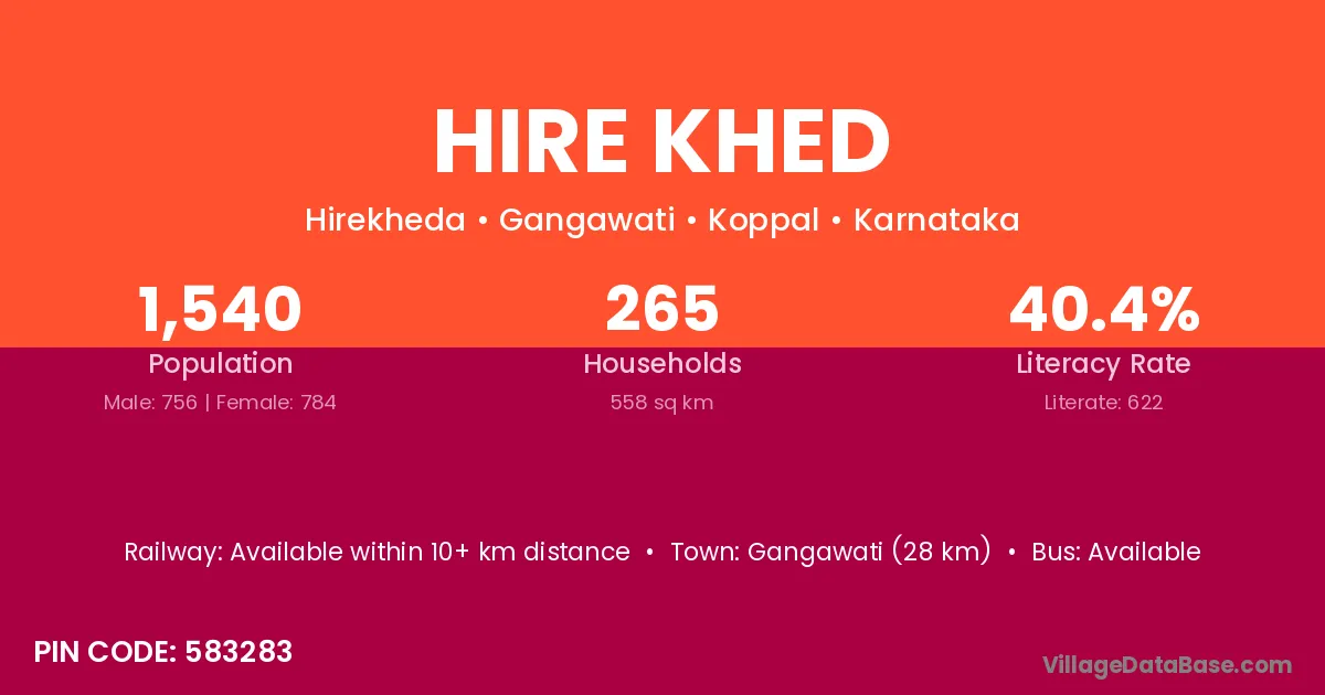Gangawati (28 km) is the nearest town to Hire Khed village for major economic activities and is located approximately 28 km away.