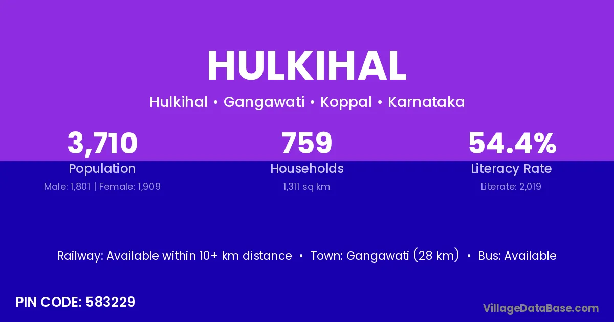 Gangawati (28 km) is the nearest town to Hulkihal village for major economic activities and is located approximately 28 km away.