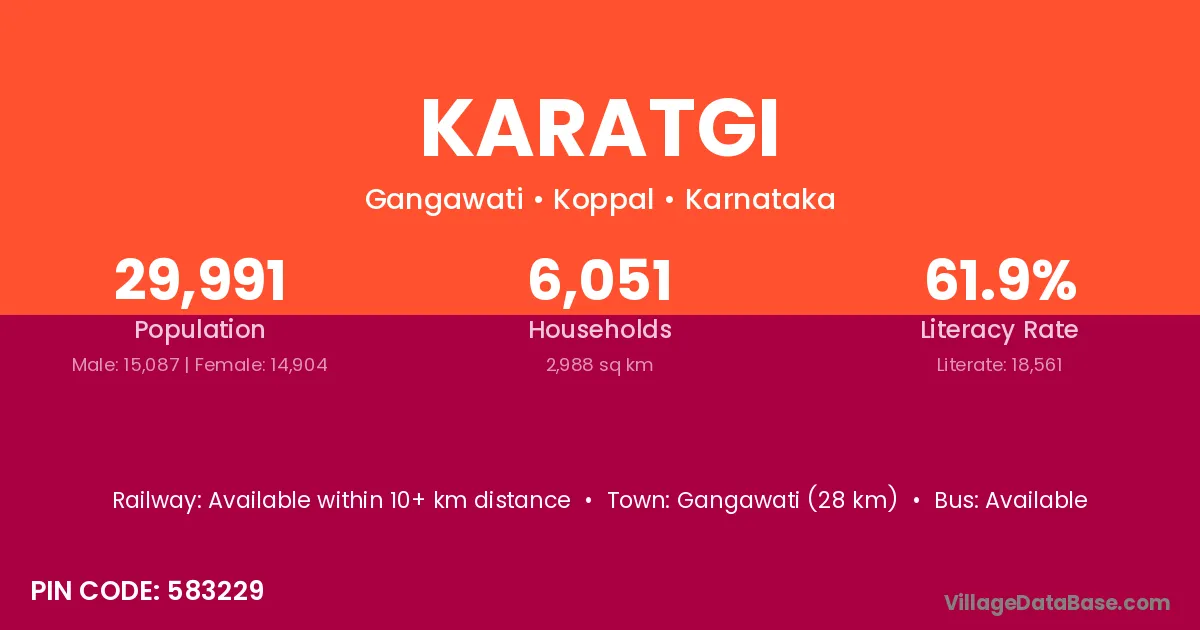Karatgi village has a total population of 29,991 people, of which 15,087 are males and 14,904 are females.
