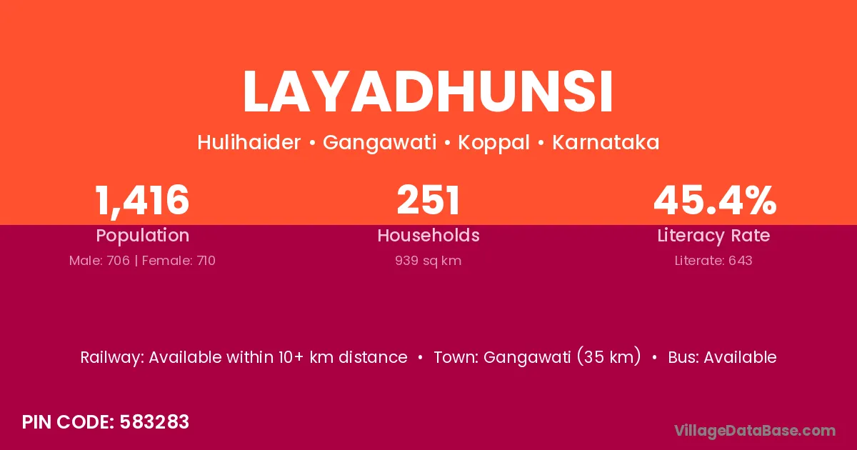 Gangawati (35 km) is the nearest town to Layadhunsi village for major economic activities and is located approximately 35 km away.