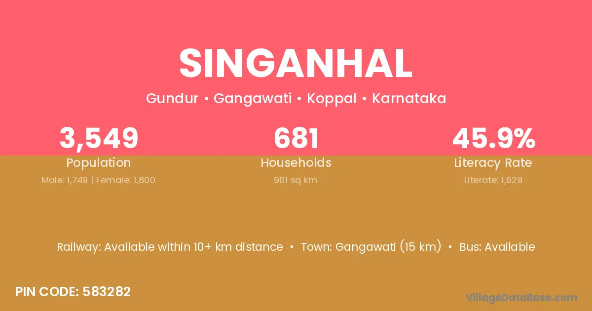 Gangawati (15 km) is the nearest town to Singanhal village for major economic activities and is located approximately 15 km away.