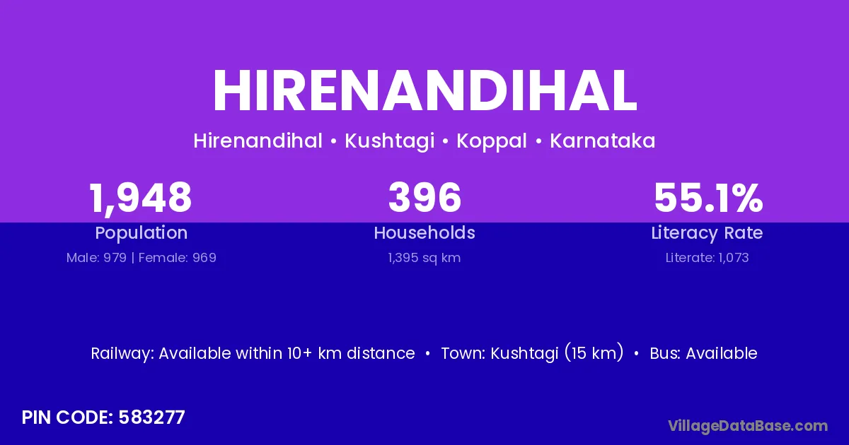Kushtagi (15 km) is the nearest town to Hirenandihal village for major economic activities and is located approximately 15 km away.
