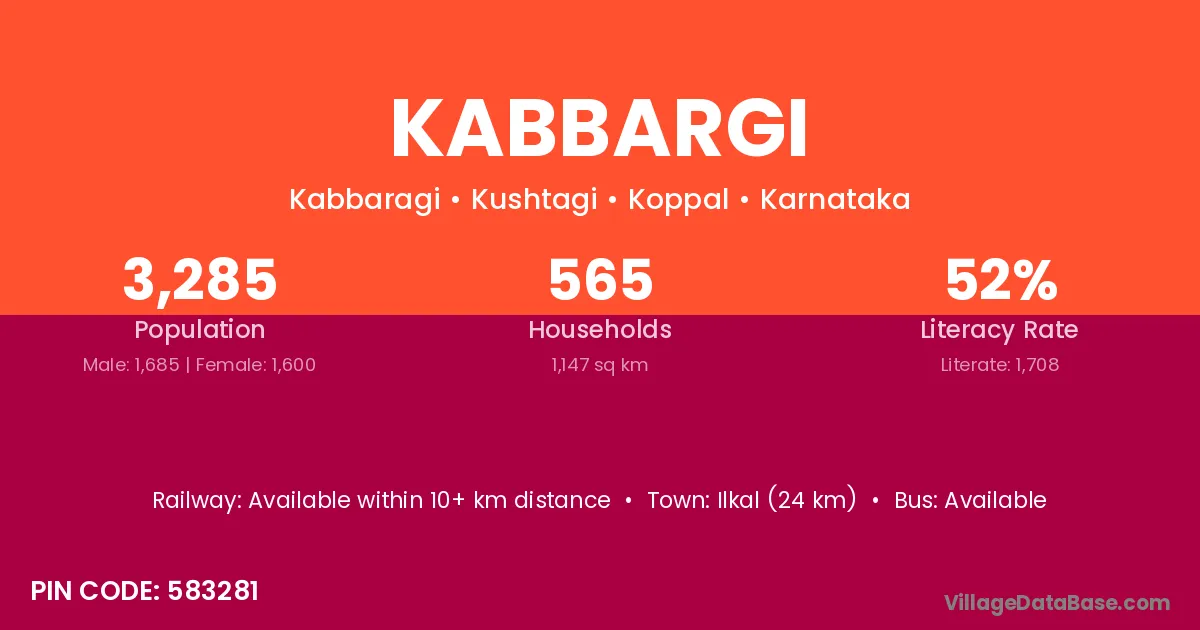 Ilkal (24 km) is the nearest town to Kabbargi village for major economic activities and is located approximately 24 km away.