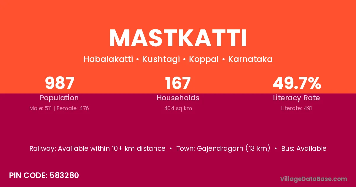 Mastkatti village has a total population of 987 people, of which 511 are males and 476 are females.