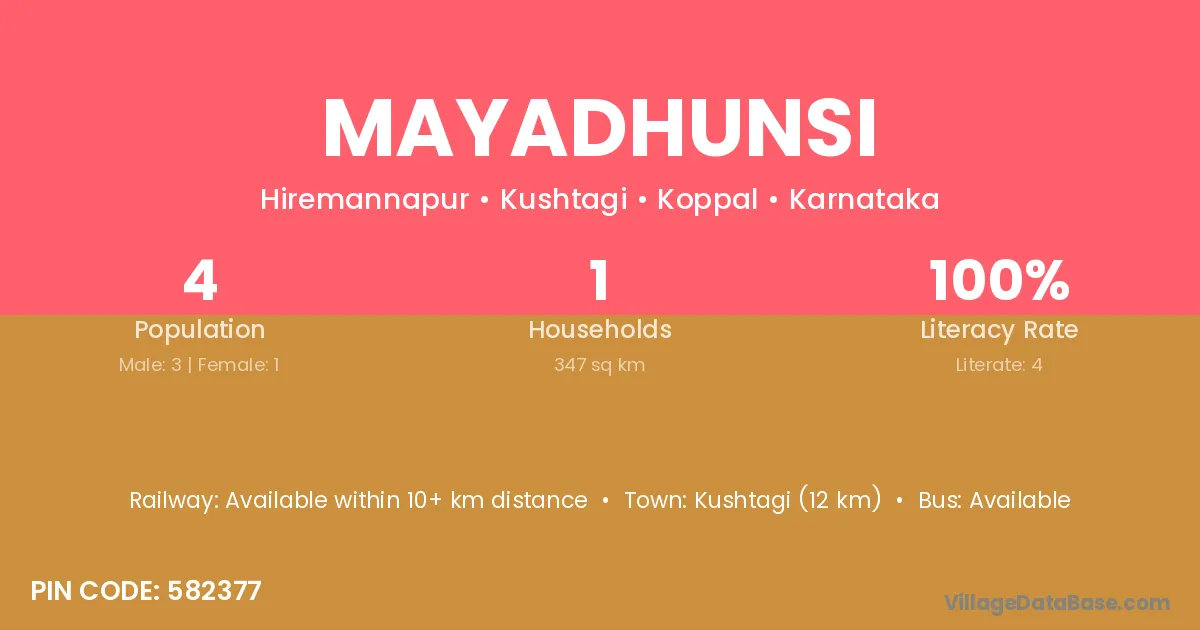 Kushtagi (12 km) is the nearest town to Mayadhunsi village for major economic activities and is located approximately 12 km away.