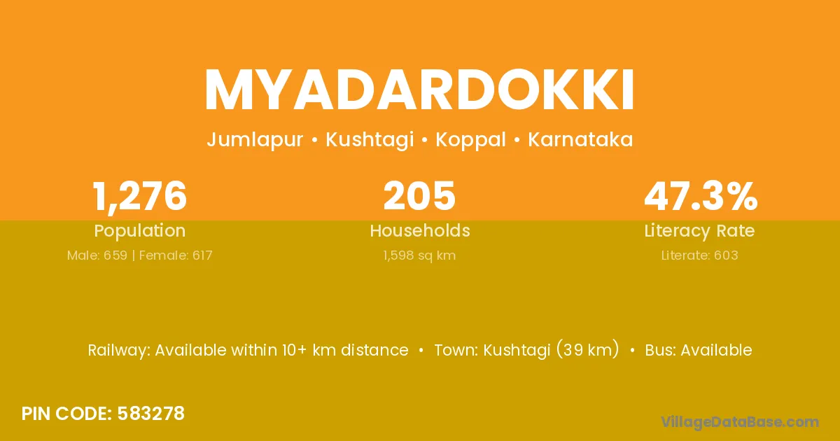 Kushtagi (39 km) is the nearest town to Myadardokki village for major economic activities and is located approximately 39 km away.