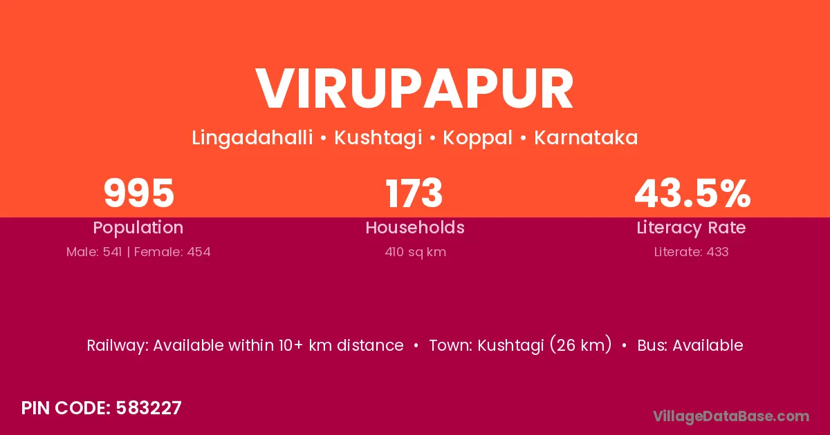 Kushtagi (26 km) is the nearest town to Virupapur village for major economic activities and is located approximately 26 km away.