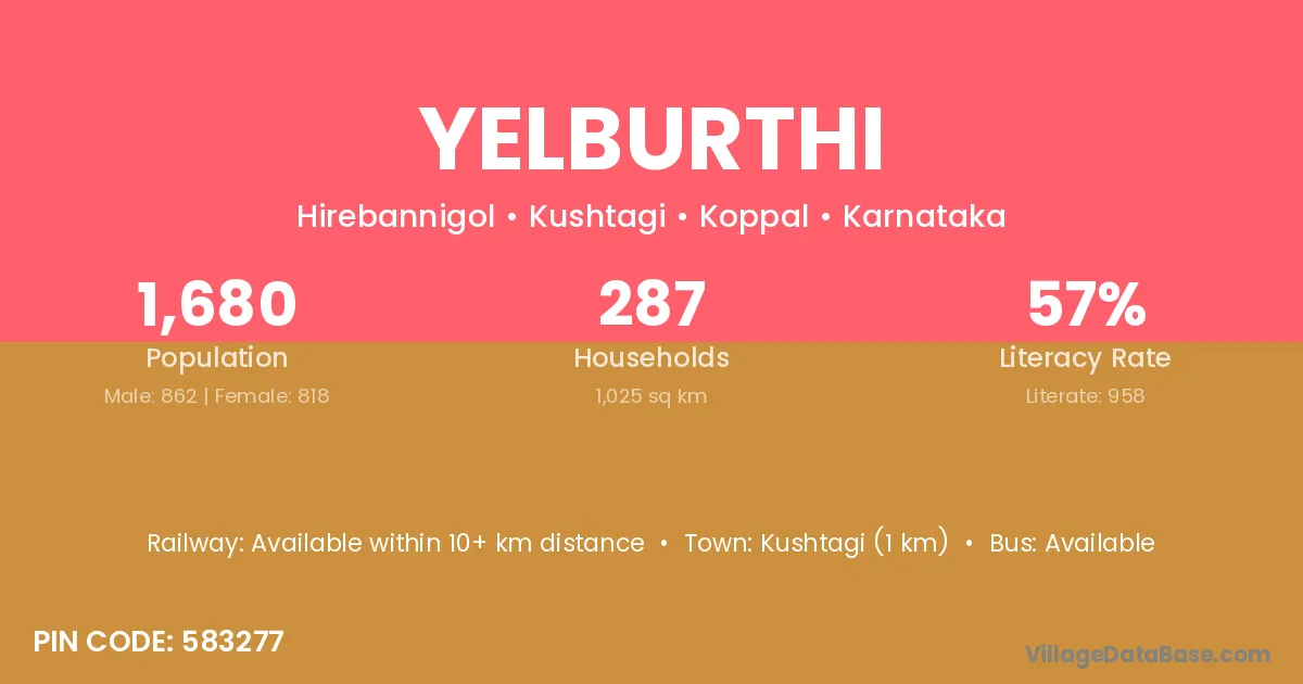 Kushtagi (1 km) is the nearest town to Yelburthi village for major economic activities and is located approximately 1 km away.
