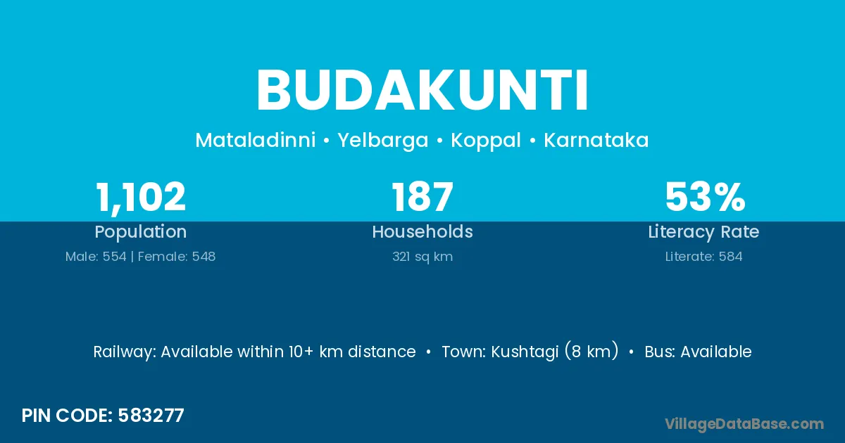 Kushtagi (8 km) is the nearest town to Budakunti village for major economic activities and is located approximately 8 km away.