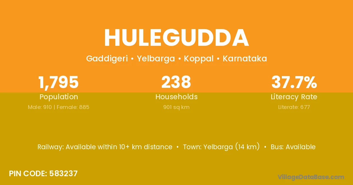 Yelbarga (14 km) is the nearest town to Hulegudda village for major economic activities and is located approximately 14 km away.