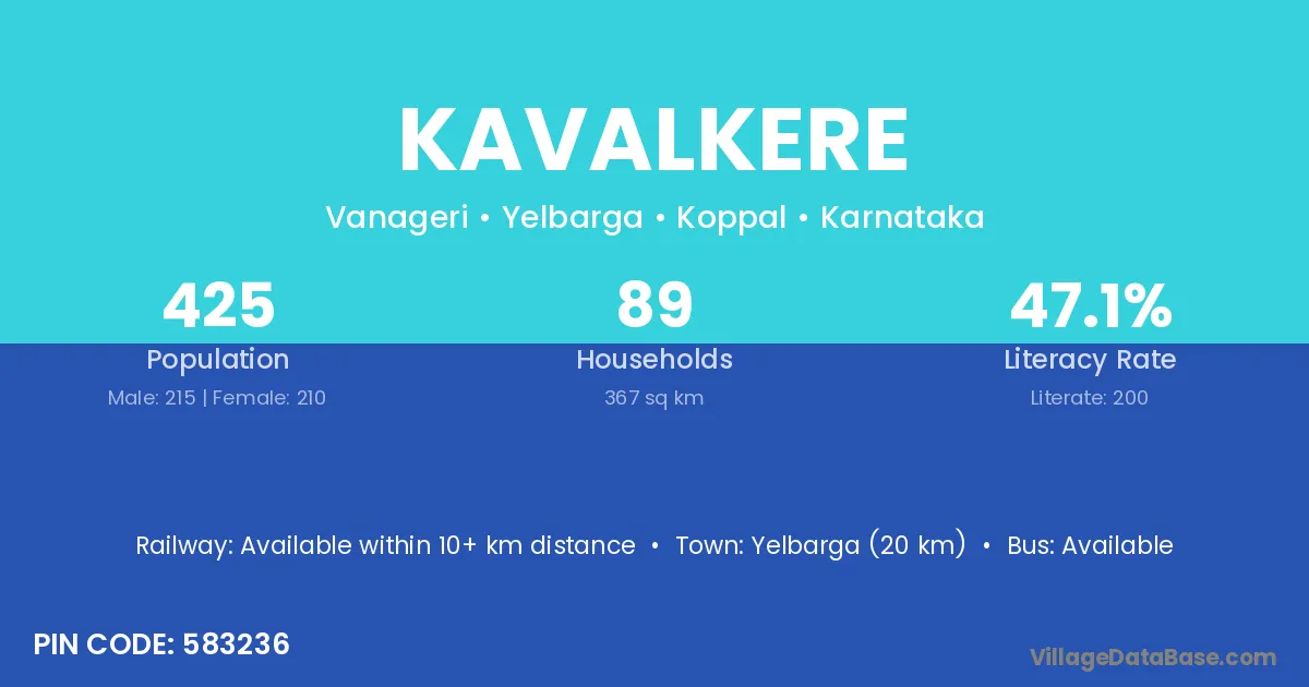 Yelbarga (20 km) is the nearest town to Kavalkere village for major economic activities and is located approximately 20 km away.
