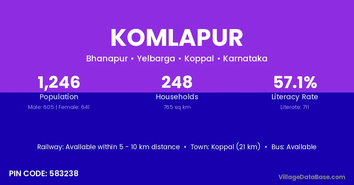 Koppal (21 km) is the nearest town to Komlapur village for major economic activities and is located approximately 21 km away.