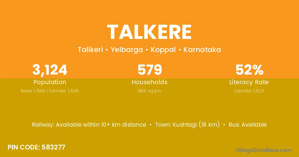 Kushtagi (18 km) is the nearest town to Talkere village for major economic activities and is located approximately 18 km away.
