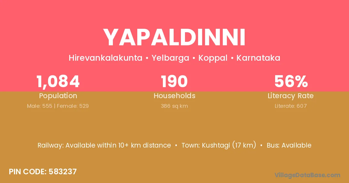 Kushtagi (17 km) is the nearest town to Yapaldinni village for major economic activities and is located approximately 17 km away.