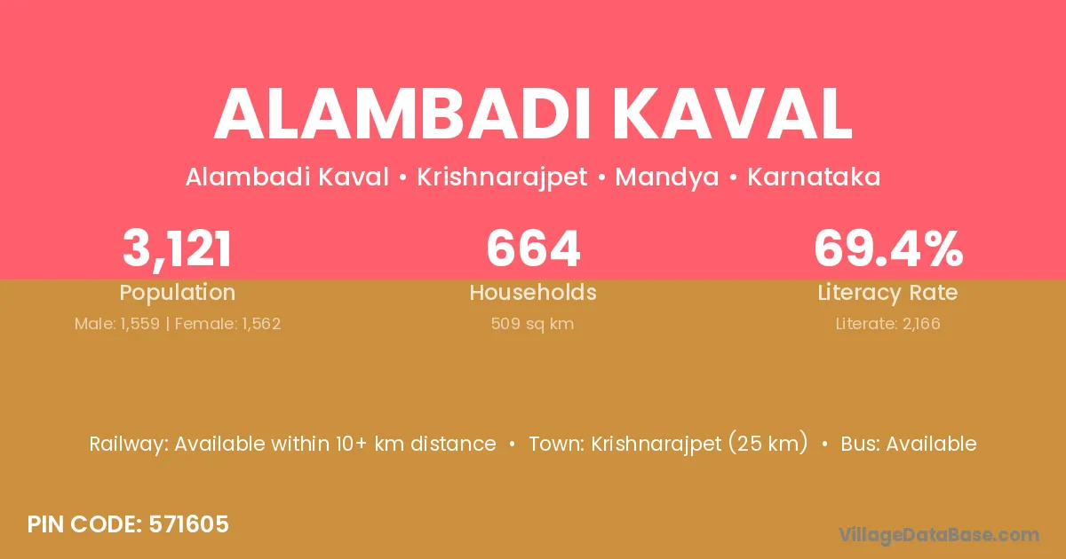 Krishnarajpet (25 km) is the nearest town to Alambadi Kaval village for major economic activities and is located approximately 25 km away.