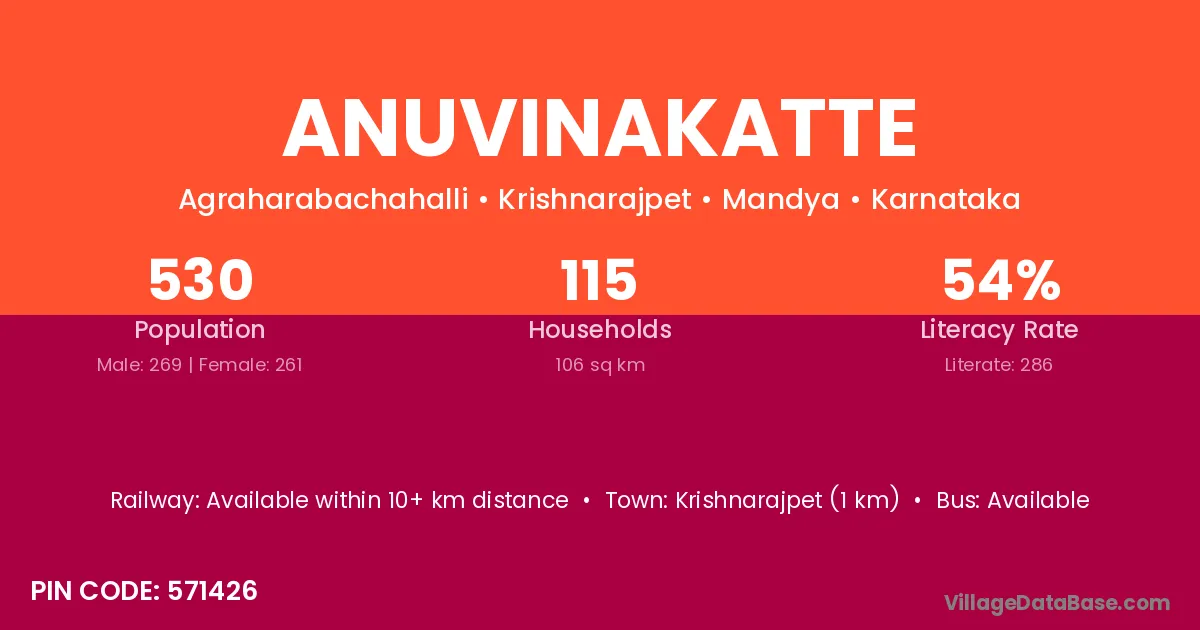 Krishnarajpet (1 km) is the nearest town to Anuvinakatte village for major economic activities and is located approximately 1 km away.