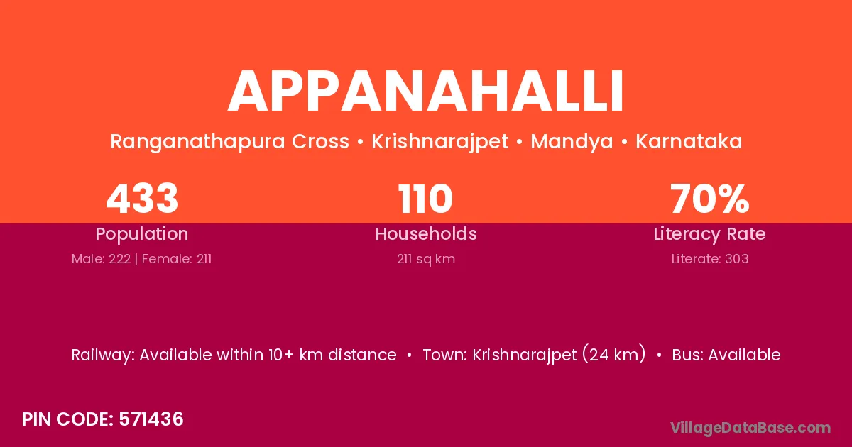 Krishnarajpet (24 km) is the nearest town to Appanahalli village for major economic activities and is located approximately 24 km away.