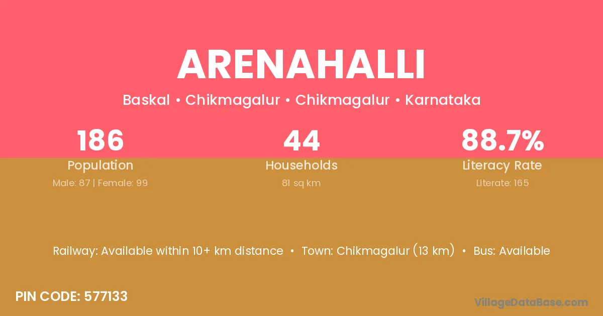 The literacy rate of Arenahalli village is 61.69%. Male literacy stands at 73.02% and female literacy at 51.11%.